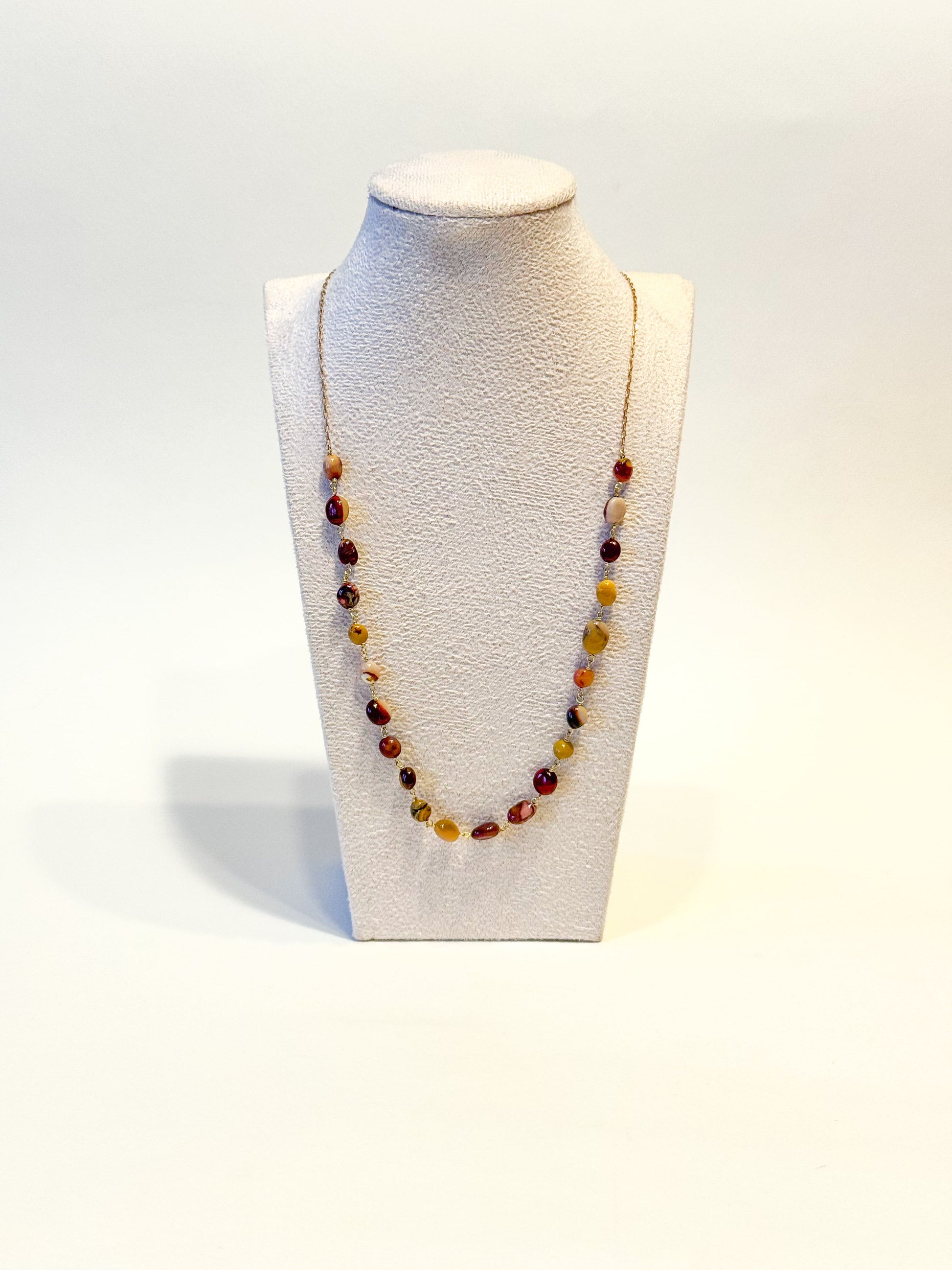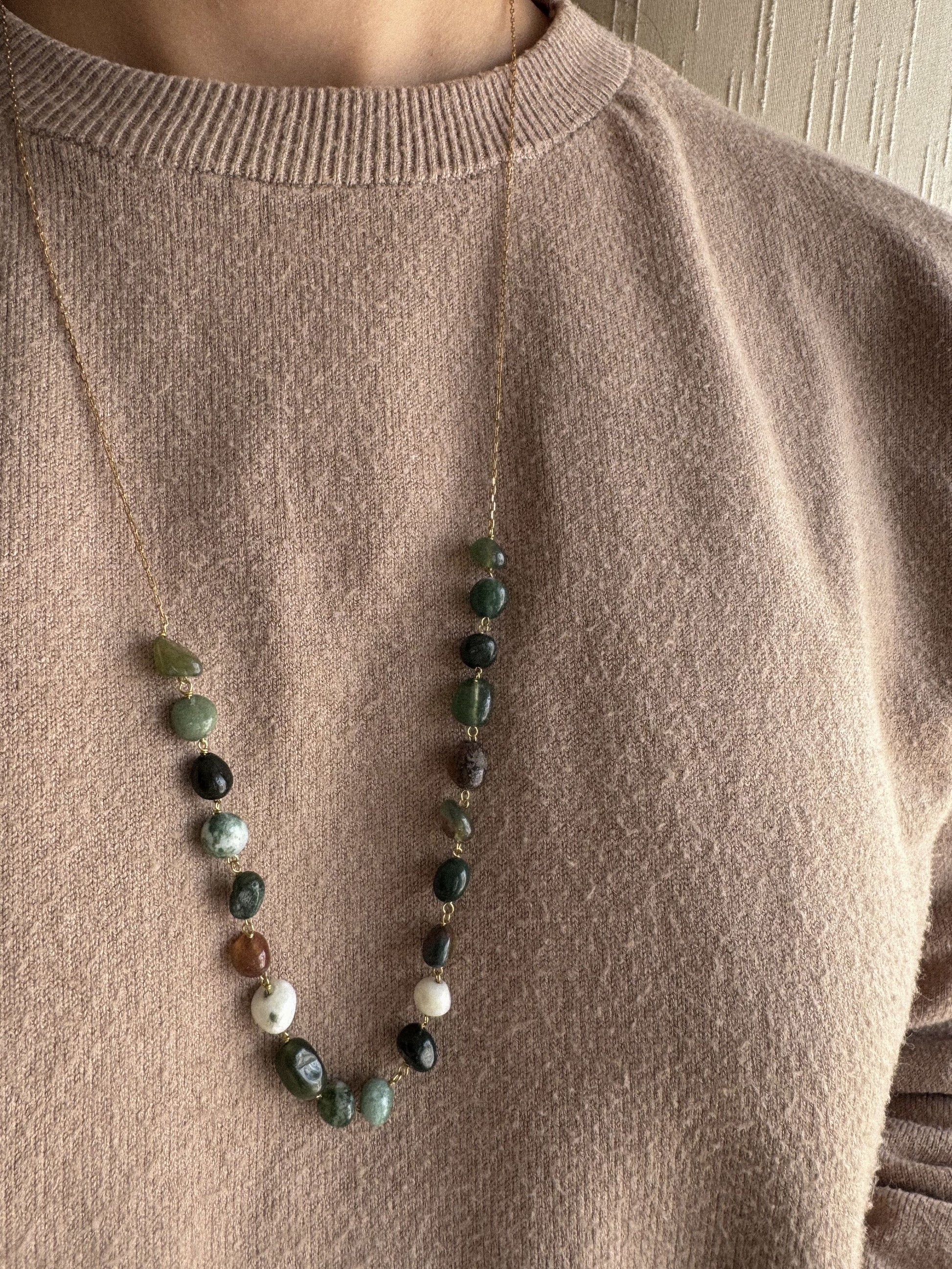 Amanti delle colane lunghe: ho quello che fa per voi. Una colana lavorata artigianalmente con pietre dure irregolari, per dnarvi delicatezza, colore e movimento. Per creare l'abbinamento perfetto, ti consiglio la combo con la collana "Soffia già" ed il bracciale "Kiwi".
