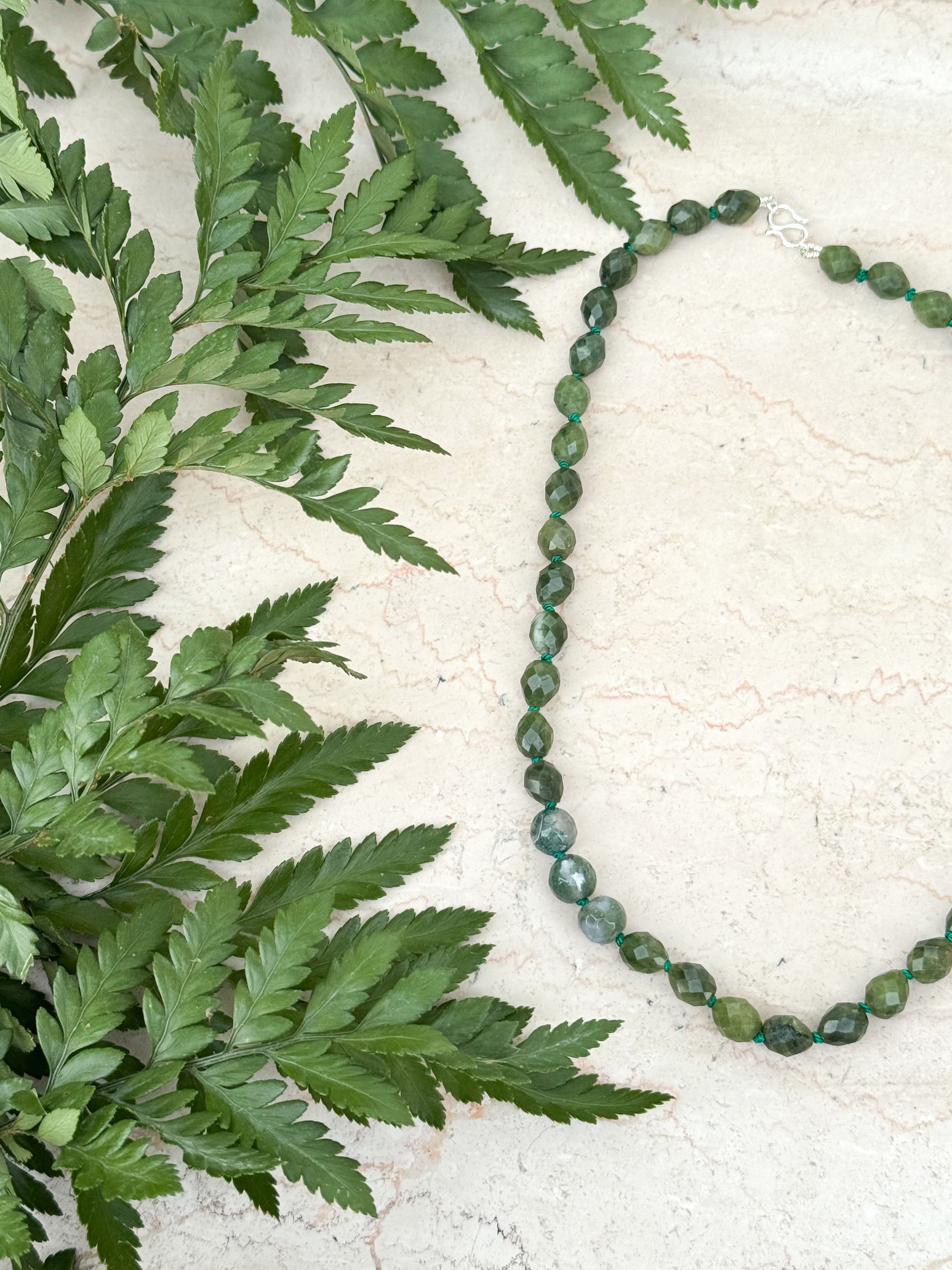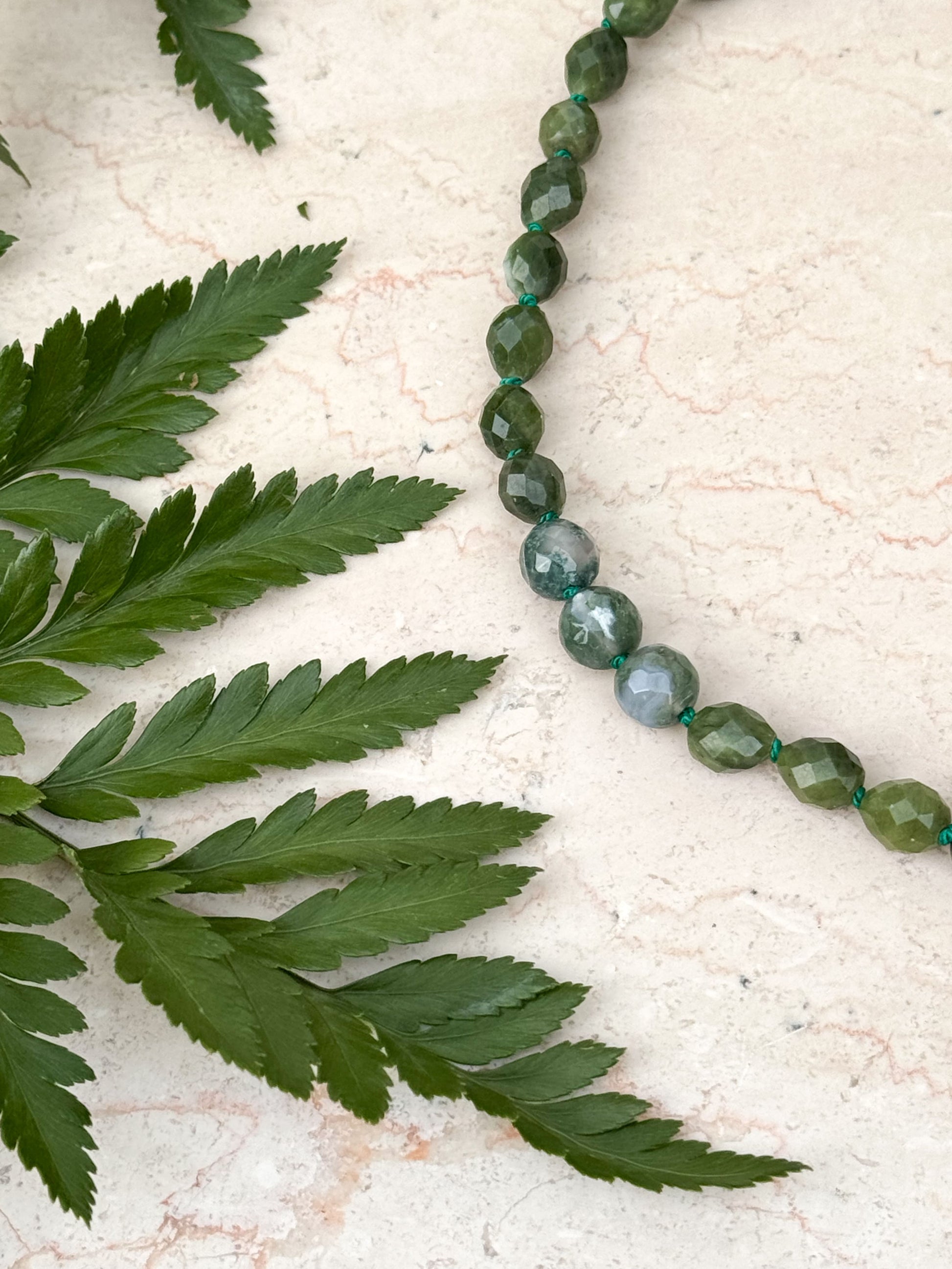 Materiali: filo di seta verde 100% naturale e pietre dure (semini 8x6mm giada verde; tonde 8mm di agata muschiata)
