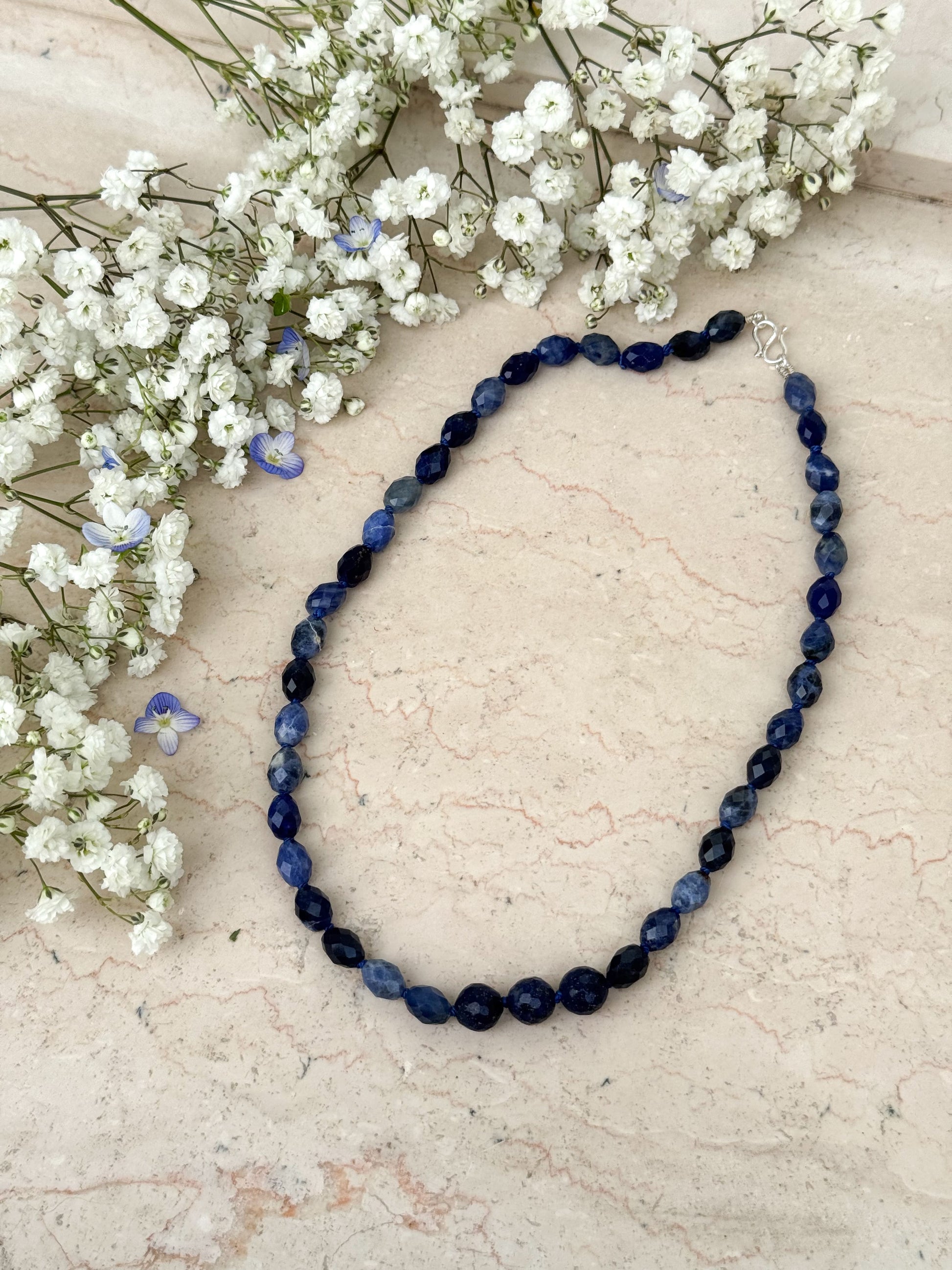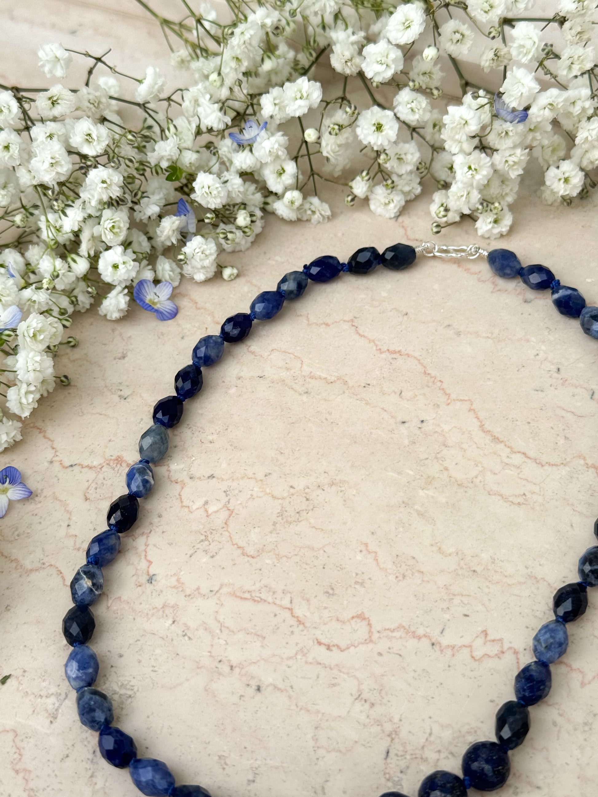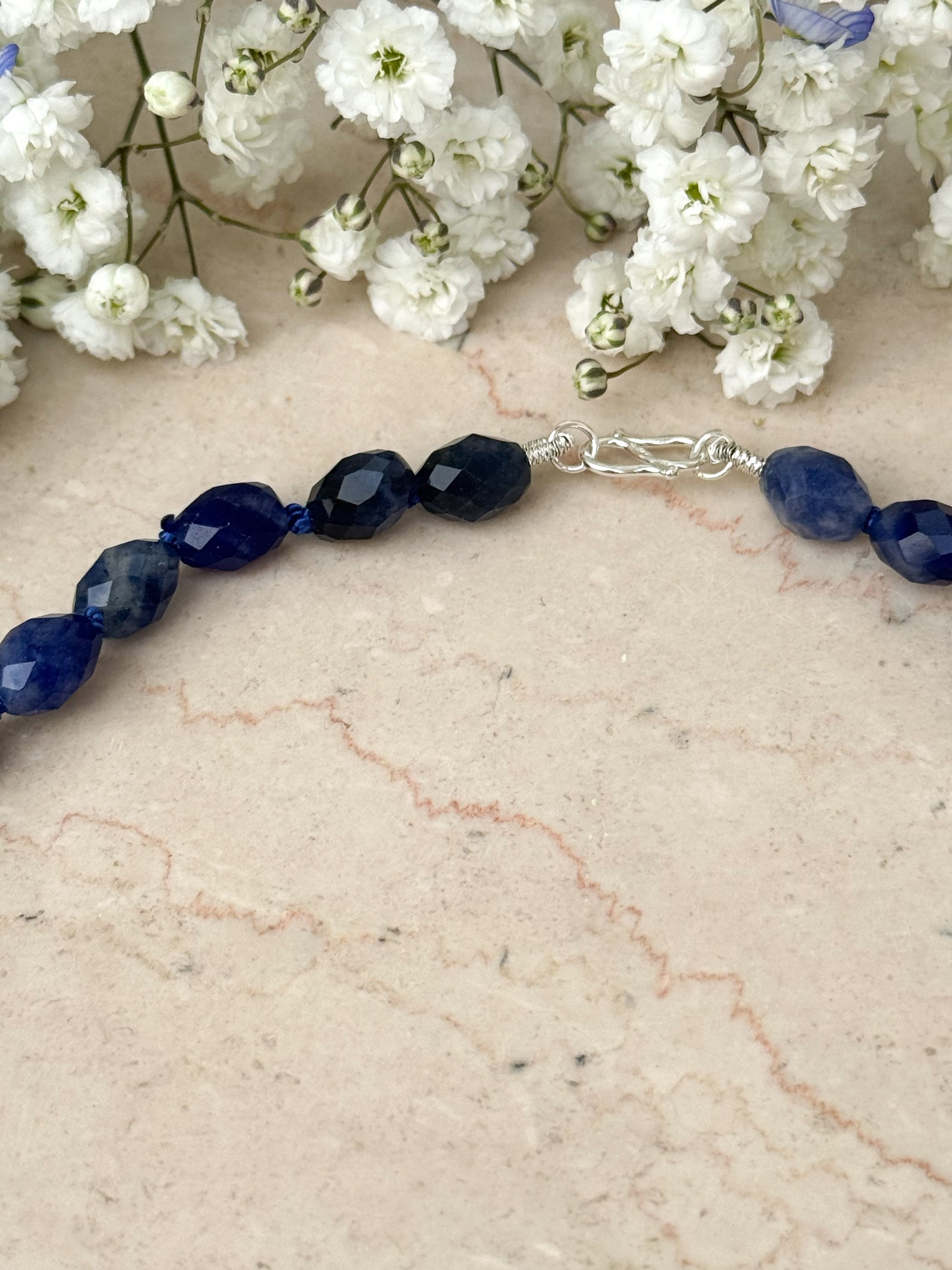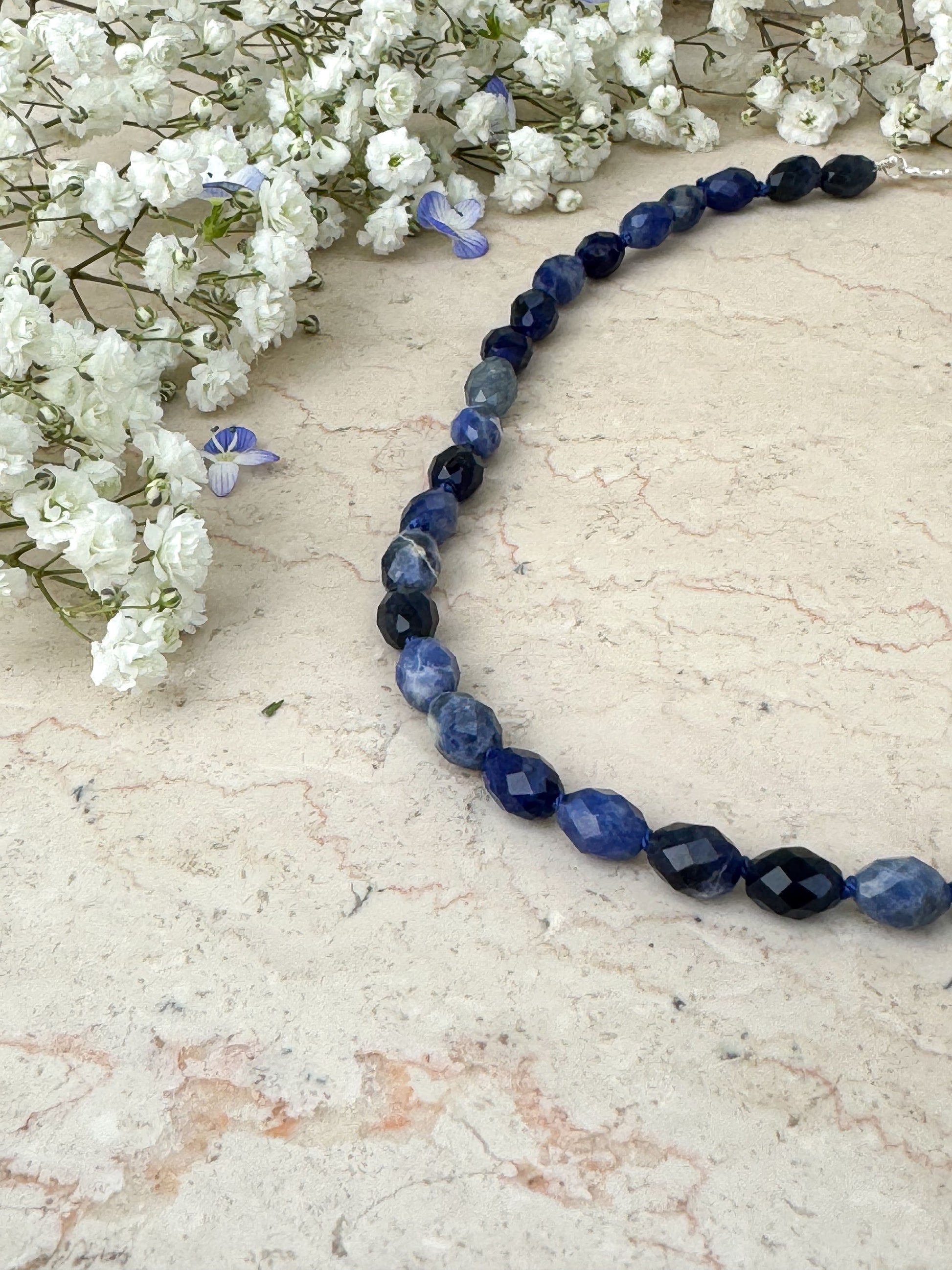 Materiali: filo di seta blu 100% naturale e pietre dure (semini 8x6mm sodalite blu; tonde 8mm di lapislazzuli)